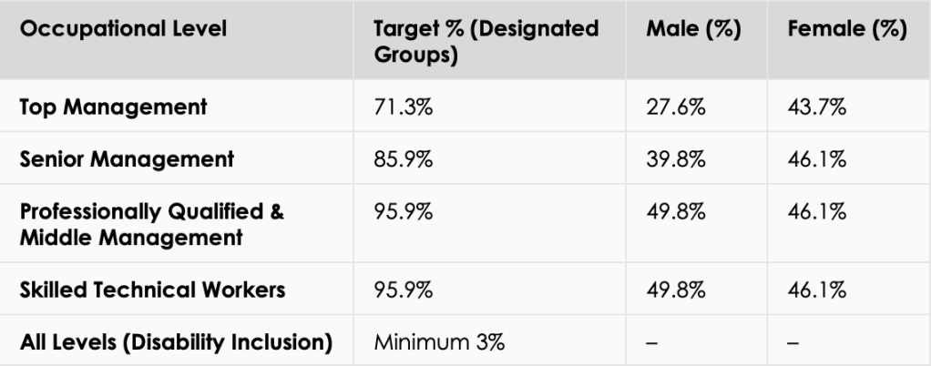 These targets are legally binding, not aspirational. Designated employers must actively report progress towards these thresholds in their annual submissions to the Department. Failure to meet or demonstrate sustained progress may result in increased scrutiny, the withholding of employment equity compliance certificates, and disqualification from doing business with the State. These figures therefore provide a compliance yardstick for designated employers.