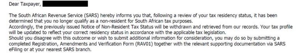 Some individuals who previously formally ceased South African tax residency — and who are in possession of the Sars issued Notice of Non-Resident Tax Status — are receiving fresh correspondence from the tax authority about a review and withdrawal of their non-resident tax status.