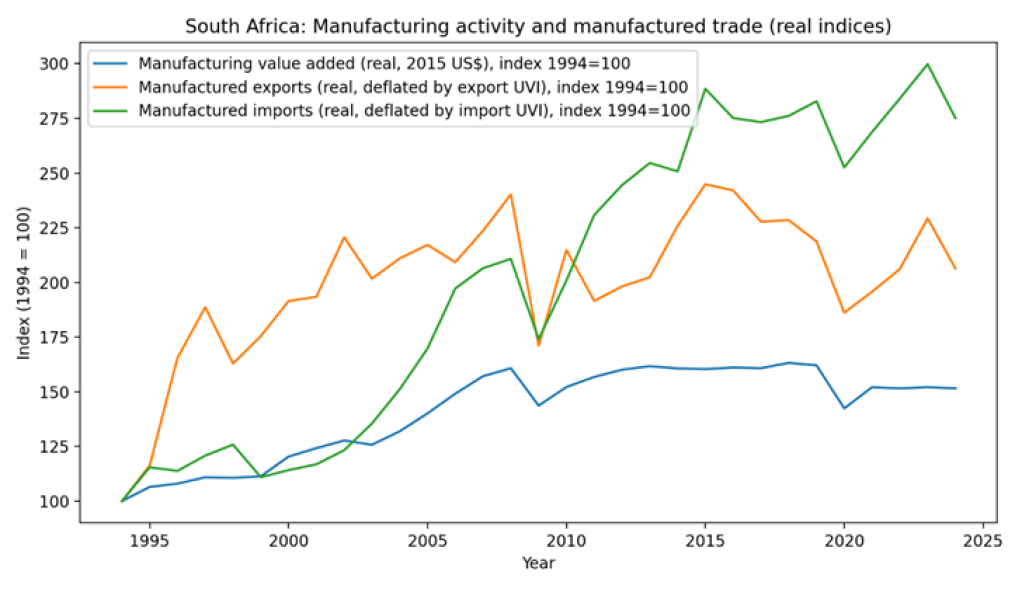 Figure 1 compares three things over time: how much South Africa produces in manufacturing, how much it exports, and how much it imports. All three are shown in real terms, meaning the effects of inflation have been removed, and the lines are indexed so that changes over time are easy to compare. The figure shows that manufacturing output grew slowly in the early years but has largely flattened since the mid-2000s. Manufactured exports follow a similar pattern, rising at first but losing momentum over time. Manufactured imports, however, continue to grow steadily and now rise much faster than both production and exports. In simple terms, the figure shows that South Africa is producing and exporting less relative to the amount it imports. This widening gap points to a weakening manufacturing base and increasing reliance on foreign manufactured goods.