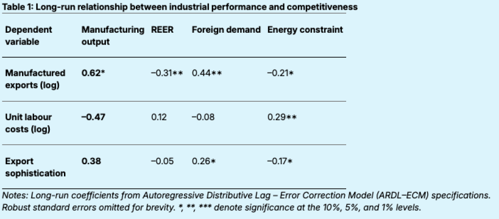 Descriptive evidence shows what is happening. To understand why it persists, we estimate long-run relationships between industrial performance and competitiveness outcomes using a national time-series framework for South Africa covering 1994–2024, examining how changes in domestic manufacturing performance over time are associated with export capacity, production costs, and export sophistication. Manufacturing performance is proxied by real manufacturing output, interpreted as a measure of system-wide productive capacity. Manufacturing is treated as an aggregate sector in order to capture overall industrial strength rather than sub-sectoral dynamics, which are left for future research. Competitiveness is measured using three indicators: manufactured exports, unit labour costs, and export sophistication. Exports and labour costs are shown in percentage terms so that the results tell us how much they rise or fall when manufacturing changes. Manufacturing output, by contrast, is treated as a measure of how much the country is able to produce. It is used to represent industrial capacity rather than demand. Controls include the real effective exchange rate (REER), foreign demand, and energy constraints.