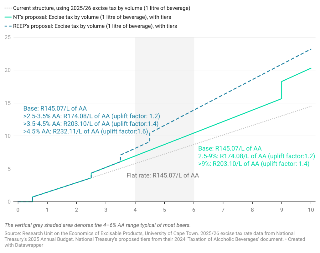 Currently (2025/26), beer is taxed at a flat rate of R145.07 per litre of AA (grey dotted line in Figure 1). A litre of beer with 4% AA is subject to R5.80 excise tax, while a beer with 6% AA is subject to R8.70 excise tax. Although this structure encourages lower alcohol content, better designed tiers would amplify these incentives.