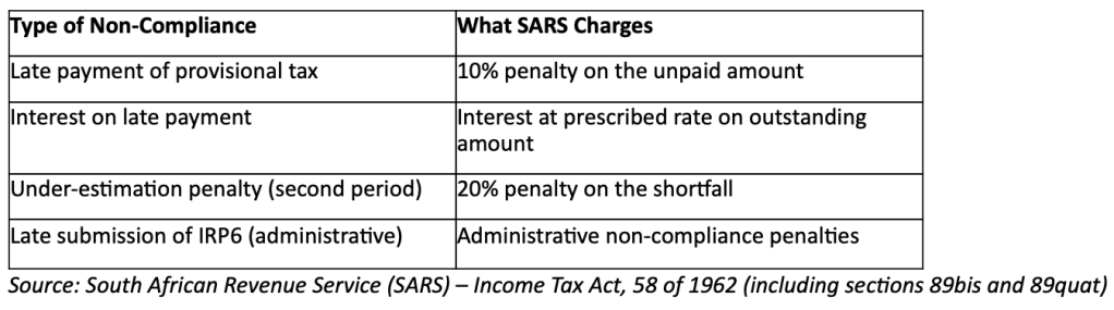 Missing provisional tax submission deadlines or failing to file the required IRP6 returns exposes taxpayers to substantial administrative penalties and interest, both of which accrue from the due date until the outstanding amount is fully settled. In many cases, the interest charged under section 89quat can exceed the original provisional tax liability.