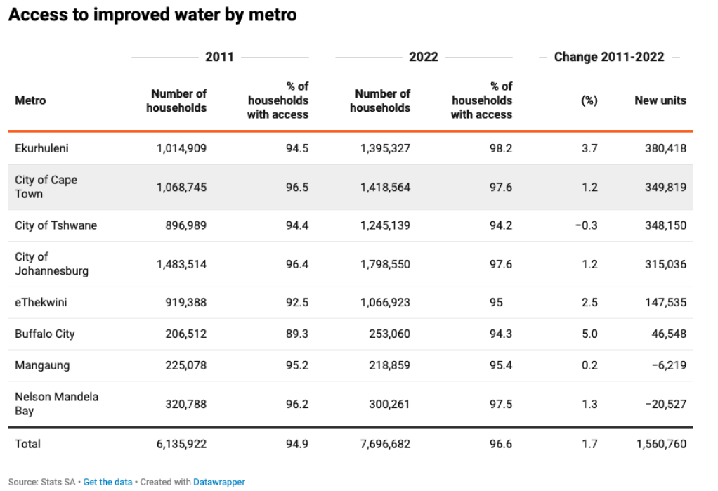 We asked Statistics South Africa (Stats SA) what the 2022 census, the most recent, shows about improved access to these services in all metros.