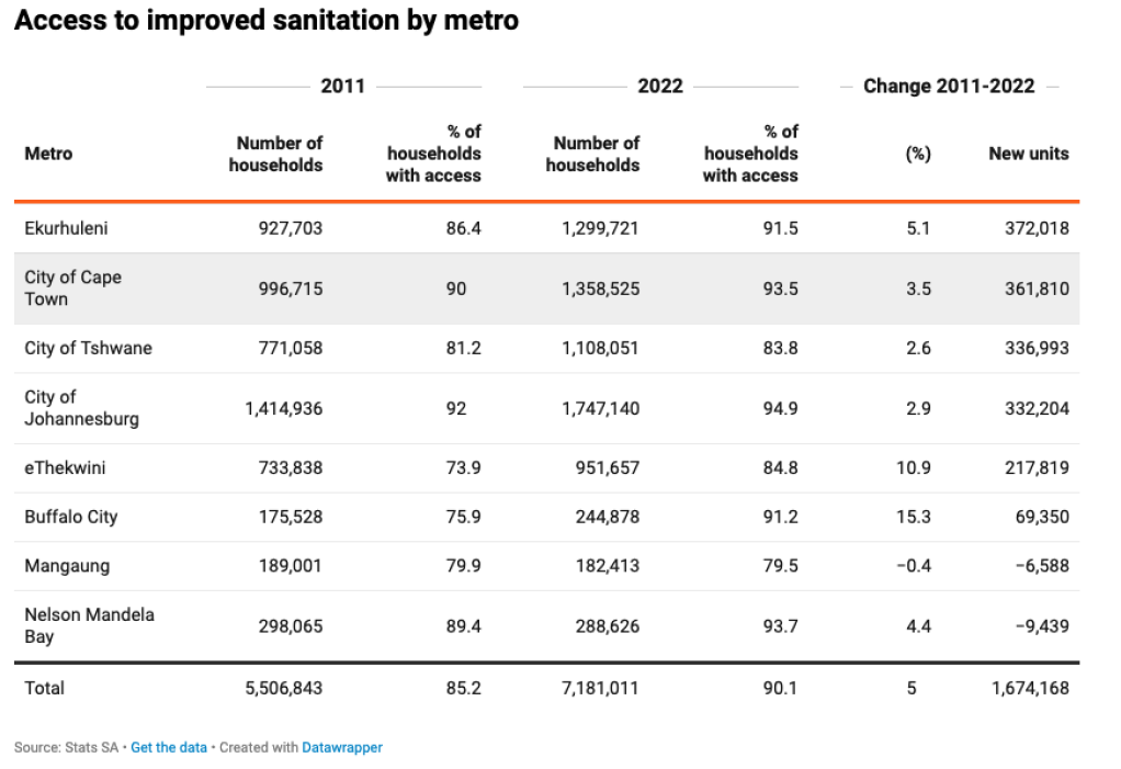 But again, a higher share of households in Cape Town (93.5%) had improved sanitation compared to the national figure of 90.1%.