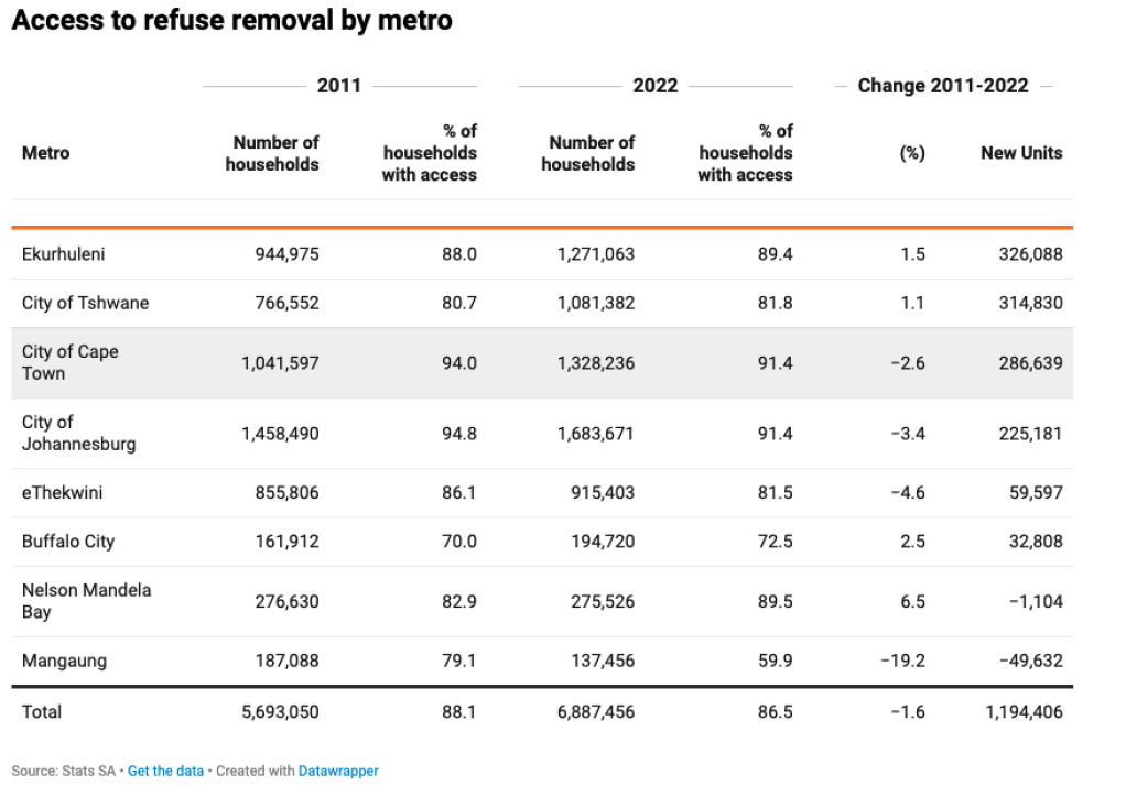 Just over 91% of Cape Town's households had access to refuse removal, compared to 86.5% nationally.