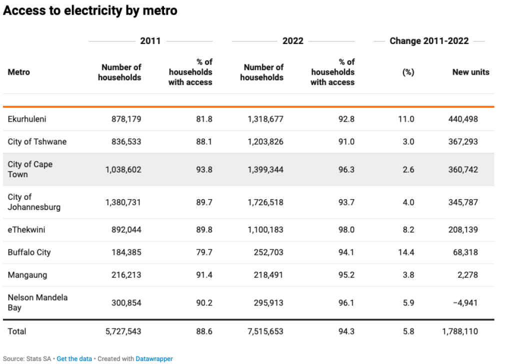 By 2022, over 360 000 more Cape Town households had access to electricity, a 3% increase from 2011. Other metros, including Ekurhuleni and Buffalo City, showed higher percentage increases.