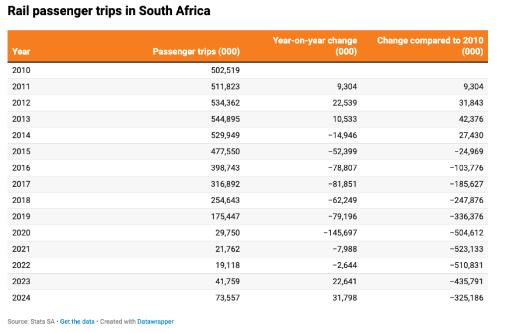 The Daily Investor article, in turn, cited Stats SA as its source. Kagisho Mathabatha, who focuses on distributive trade statistics at Stats SA, sent Africa Check data on rail passenger trips. It showed that there were over 500-million in 2010 and 73.5-million in 2024.