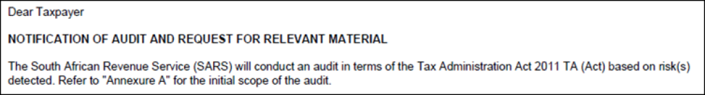 Imagine having historically filed all your tax returns on time, making good on your dues to Sars, and your Compliance Status reflecting as fully compliant. Now imagine waking up to a Notification of Audit and Request for Relevant Material, “based on risk(s) detected”.