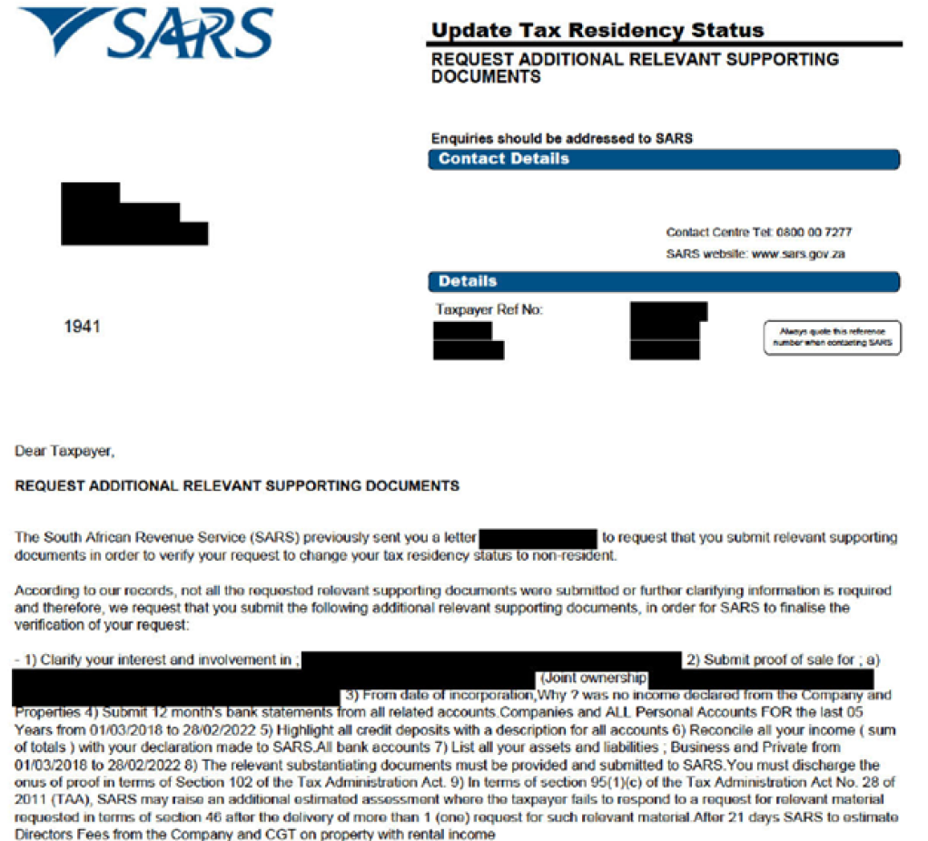 These requests, as seen in the example below, often follow a submission of an application for a Sars Notice of Non-Resident Tax Status, the official confirmation that one has ceased to be a tax resident of South Africa.