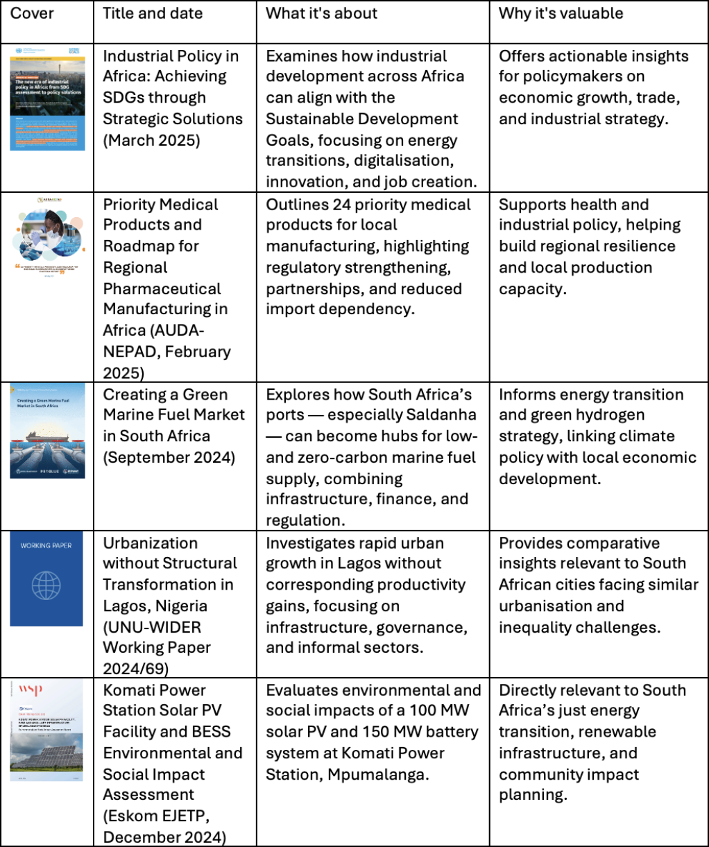 Below are examples of recent publications especially relevant for policymaking and research in South Africa / Africa—illustrating the breadth and depth of what’s available: