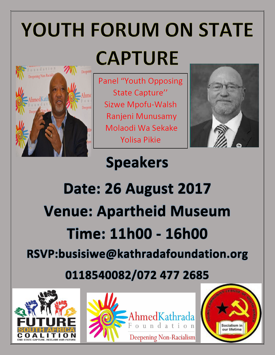 The Ahmed Kathrada Foundation, supported by the Young Communist League of South Africa and FutureSA, invite members of the media to the first youth forum on state capture on Saturday at the Apartheid Museum.